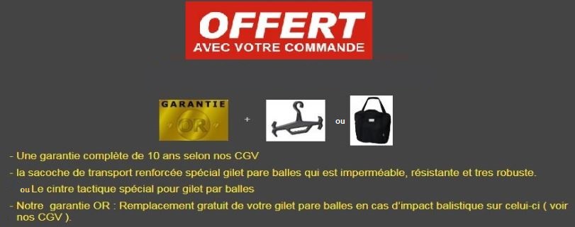 HTChez nous, pour 1 gilet pare balles acheté, nous offrons gratuitement à nos clients. - L ’option garantie OR ( échange du gilet contre un neuf en cas d’impact ) selon nos CGV. - 1 sac de transport renforcé spécial gilet pare balles. Ce gilet pare balles offre une protection balistique complète de niveau IIIA
